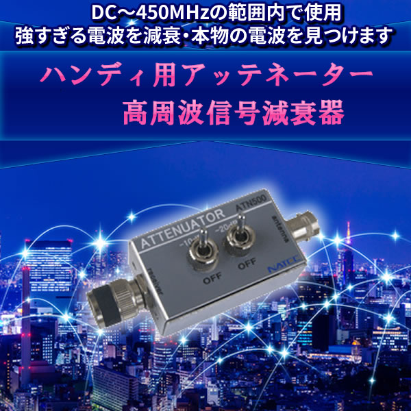●ATN500は、DC~450MHzの範囲内で使用できるアッテネータです。強すぎる電波を減衰する事で本物の電波を見つけます。電波の発信元検索に便利にお使いいただけます。![]() |