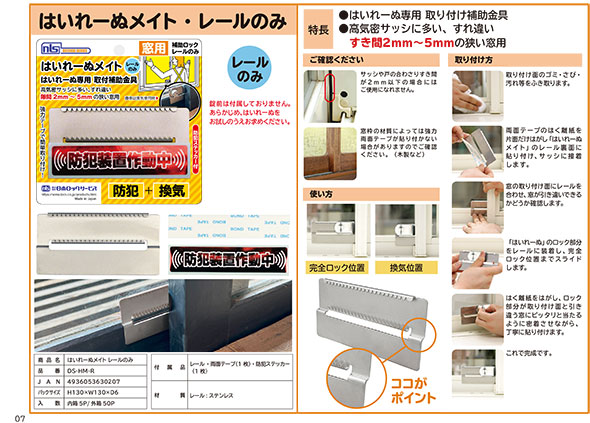 ※ 仕様及びデザインは予告無く変更する場合があります。 使用上の注意事項 ・サッシの形状により、取り付けできない場合がございます。 ・貼り直しをするとテープは本来の粘着力を発揮できません。 ・接着後の取り外しは市販のシールはがし液を使用し、時間をかけて行ってください。サッシの退色、変色、キズ等の責任は負いかねます。 ・監禁などに利用しないでください。 ・本品は防犯向上を意図した商品ですが、防犯はお客様のご注意、ご配慮に代わるものはございません。万一の事故、破壊、犯罪、トラブル等が発生いたしましても当社は一切の補償、弁償などは行いません。ご理解いただきますようお願いいたします。 ・改良のため、予告なく商品仕様を変更する場合がございます。 |