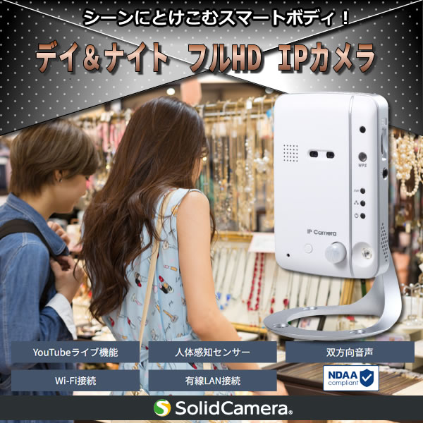 You tubeライブ配信対応モデル!周囲にとけこむ外観で、気になる場所を見逃すことなくしっかりキャッチする固定式モデル「デイ&ナイト フルHD IPカメラ IPC-06FHDII」です。赤外線レンズ搭載で暗闇にも強く、24時間見守り可能です。ビューラはPlug&Playでかんたん接続・設定接続から視聴まで3ステップ!数分もあれば誰でも接続できます。接続に必要なのは、インターネット環境とカメラID・パスワードのみ。メーカー保証、サポートもしっかりしていますので、安心して使用できます。店舗や事務所の様子を確認!ペットやご家族の見守り!倉庫や工場を監視!等さまざまなシーンで大活躍のネットワークカメラです。