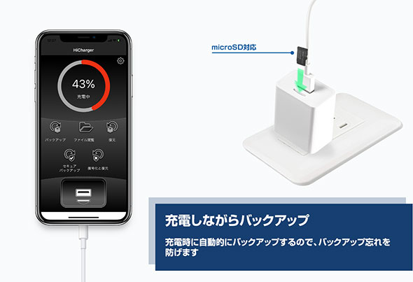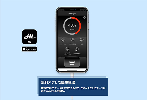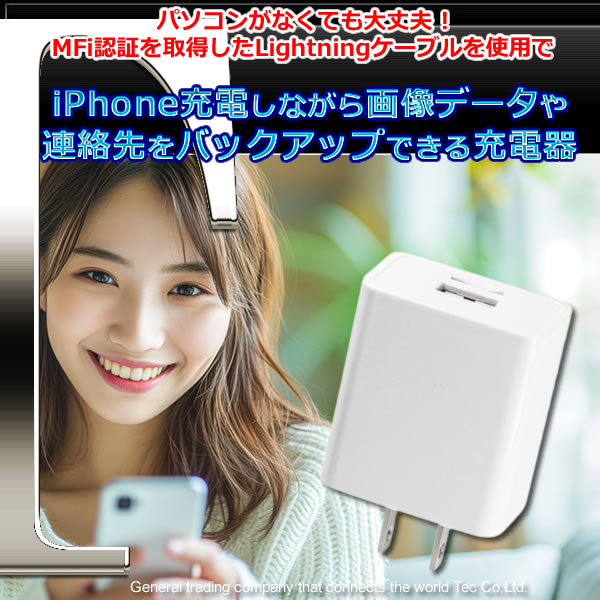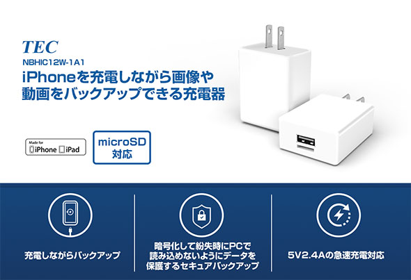 MFi認証を取得したLightningケーブルを使用することで、接続時に充電を行いながらカメラロールへ保存されている画像や動画データを選択または自動でバックアップを行うことができる「iPhone充電しながら画像データや連絡先をバックアップできる充電器 NBHIC12W-1A1」です。充電しながらバックアップでき、データは暗号化して紛失時にPCで読み込めないように保護するセキュアバックアップ対応で5V2.4Aの急速充電対応です。PCがなくても画像と動画、連絡先の復元ができます。無料アプリでデータを管理できるのでデバイスごとのデータが混ざることもありません。