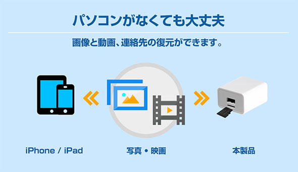 ※ 仕様及びデザインは予告無く変更する場合があります。 ※ 全てのmicroSDカード、Lightningケーブルの動作を保証するものではございません。 ※ 本製品でバックアップできるデータはカメラロールの画像および動画、連絡先となります。 そのほかのアプリケーションやゲームデータ等はバックアップいたしません。 ※通常バックアップおよびセキュアバックアップは初回時に設定したバックアップ方法どちらかを設定すると、以降は設定したバックアップ方法のみ行えます。 ※個別選択バックアップはデータアクセス権の都合上、従来保存されているデータはバックアップできません。新規で追加された画像のみバックアップが可能です。 |