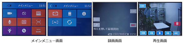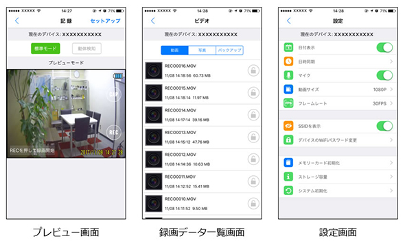 ![]() 専用アプリをインストールしたスマートフォンやタブレットにてWi-Fi接続が可能です。 撮影画面の確認や録画のオンオフのコントロール、解像度やフレームレート、日時設定などさまざまな設定ができます。 また、録画データをダウンロードできます。