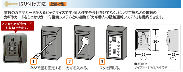 こちらのタイプは複数のカギやカードが入るビッグサイズです。個人住宅や会社だけでなく、ビルや工場などの複数のカギやカードをしっかりガード。不正に取り外された場合の商品として警報スイッチ付のPS7-T(タンバースイッチ付)があります。