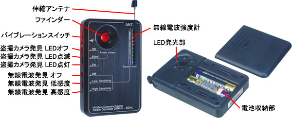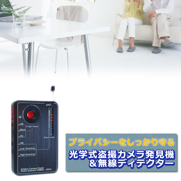 | 光学式カメラ発見機能と無線電波発見機能をダブル搭載! ● LED発光を利用した盗撮カメラ発見機能 盗撮カメラにはレンズがあります。カメラのレンズに直接LEDの光を反射させて、その有無を確認します。反応がわかりやすいので、どなたでも簡単にお使いいただけます。また無線式カメラ・有線式カメラ両方の発見にお使いいただけます。LEDは点灯/点滅の2モードから選択できます。 ● 無線ディテクター機能 無線式の盗撮カメラ(ワイヤレスカメラ)や盗聴器など、電波を発する機材を探すことのできる、無線ディテクター機能を新たに搭載しました。受信周波数帯は20MHz~6GHzのワイドレンジを実現、盗撮・盗聴器のどちらにも対応します。 4色・10セグメントのバーLEDを採用し、電波強度をひと目で確認することができます。受信モードはLOW/HIGHの2段階、アンテナも伸縮しますので、受信感度を自在に調節することにより、電波発信源の特定に効果を発揮します。 ※デジタルワイヤレス防犯カメラ等、デジタル方式の機材には反応しません。また盗聴・盗撮機以外の機器にも、対応周波数帯の電波を発していれば反応します。 ● バイブレーション機能 無線ディテクター機能を使用時、一定強度以上の電波を受信するとバイブレーションでお知らせします。バイブレーションはON/OFFが可能です。 ● 軽量・コンパクトサイズ 手のひらサイズのボディで、容易に持ち運ぶことができます。電源は単4電池×2本で、電池切れの際は気軽に交換できます。 |