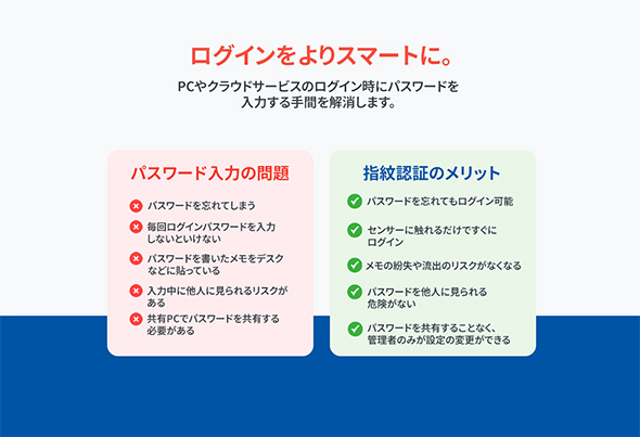 本製品で指紋の照合を行うことで認識の速度が速く、360°認識によりサッと触れるだけでログインが可能です。