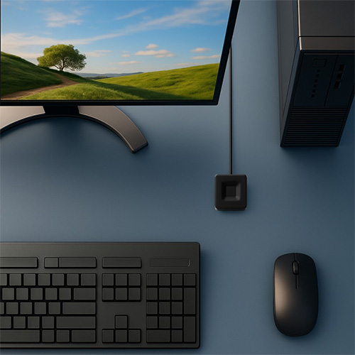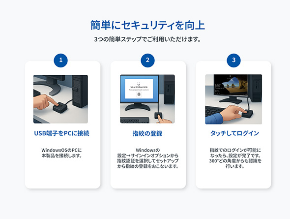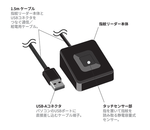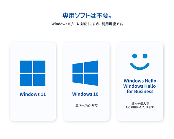 Windows 10/11のWindows Hello/Windows Hello for Businessに対応し、1.5mのUSBケーブルタイプのため、オフィスのデスクトップPCやご自宅のPCでご利用いただけます。