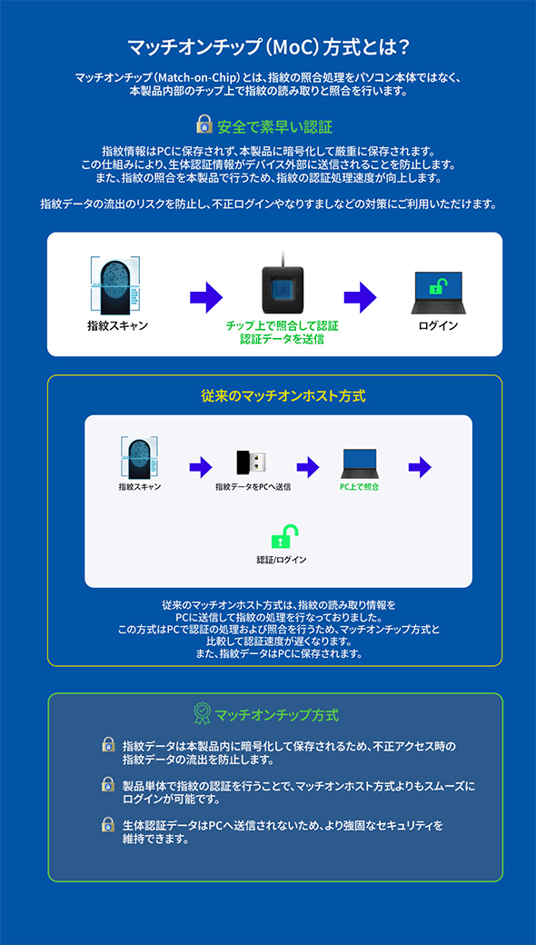 「有線接続1.5m マッチオンチップ方式 デスクトップ向けUSB指紋認証デバイス TE-FPA-CA1」は、マッチオンチップ(MoC)方式を採用したUSB指紋認証デバイスです。指紋データをデバイス内で暗号化して保存することで、指紋データの流出を防止します。Windows 10/11のWindows Hello/Windows Hello for Businessに対応し、1.5mのUSBケーブルタイプのため、オフィスのデスクトップPCやご自宅のPCでご利用いただけます。本製品で指紋の照合を行うことで認識の速度が速く、360°認識によりサッと触れるだけでログインが可能で最大10個の指紋登録で共有のPCにもご利用いただけます。