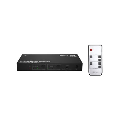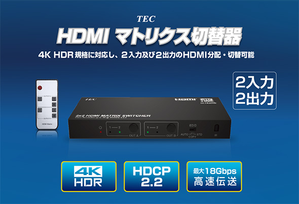 4K HDR規格に対応し、2入力及び2出力のHDMI分配・切替可能な「リモコン付 HDMIマトリクス切替分配機 THD22MSP-4K60」です。4K60Hz HDRの入出力に対応した、2入力2出力HDMIマトリクス機で1つのHDMI入力を2台のモニターに分配出力したり、2つのHDMI入力をモニターに切り替えて表示を行うことができます。