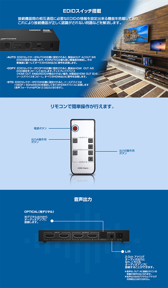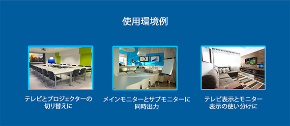 1つのHDMI入力を2台のモニターに分配出力したり、2つのHDMI入力をモニターに切り替えて表示を行うことができます。