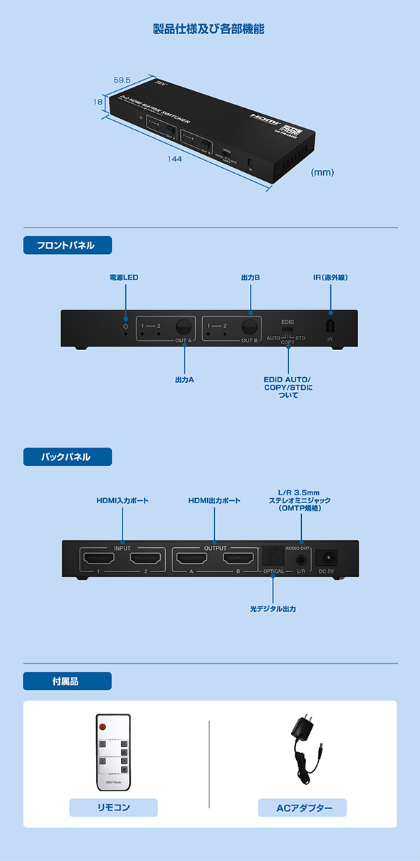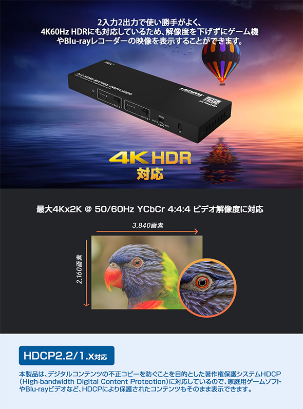 ◎4K60Hz HDRの入出力に対応した、2入力2出力HDMIマトリクス機です。