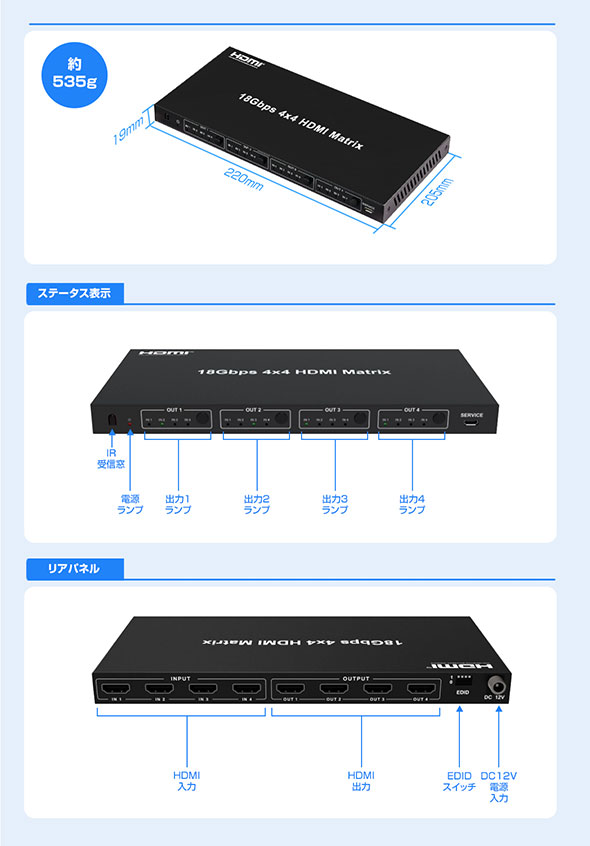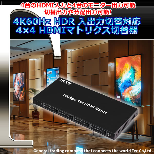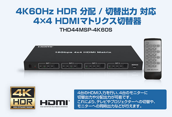 | 製品名 | 4K60Hz HDR 入出力切替対応 4×4 HDMIマトリクス切替器 THD44MSP-4K60S |