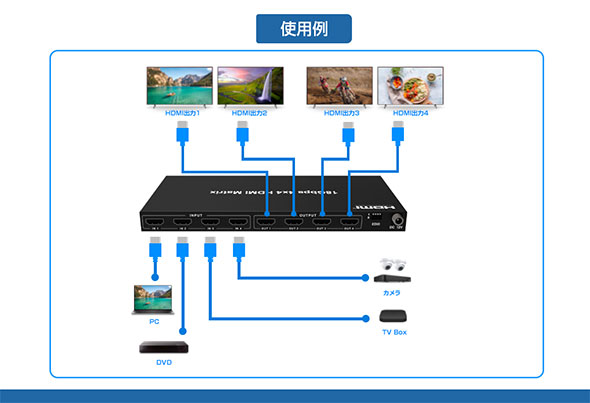 4台のHDMI入力と、4台のモニター出力が可能で、切替出力や分配出力が 可能です。