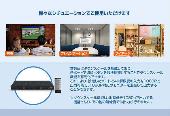 本製品は、最大4K2K@60Hz YCbCr 4:4:4の解像度に対応している「4K60Hz HDR 入出力切替対応 4×4 HDMIマトリクス切替器 THD44MSP-4K60S」です。4台のHDMI入力と、4台のモニター出力が可能で、切替出力や分配出力が 可能です。本製品はダウンスケールを搭載しており、各ポートで切替ボタンを数秒長押しすることでダウンスケール機能を有効化できます。これにより設定したポートで4K解像度の入力を1080Pで出力可能で1080P対応モニターを混在して出力することができます。※ダウンスケール機能は4K解像度を1080Pで出力する機能となり、その他の解像度では出力が行えません。