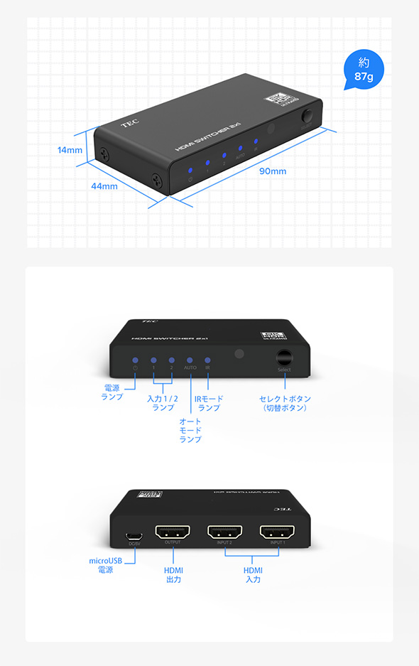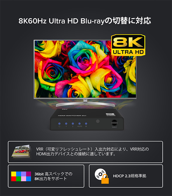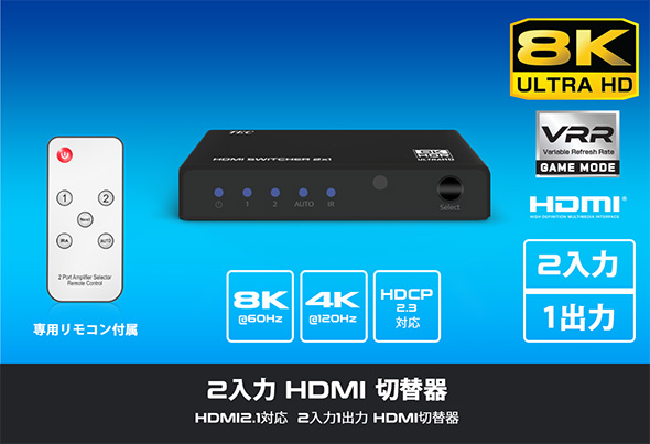 | 製品名 | リモコン付 8K対応 HDMI切替器 HDMI2.1対応 2入力1出力 THDSW21-8K |