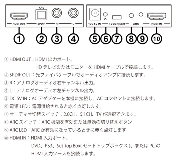 4K2Kの入力に対応し、HDMIの映像はスルーなのでそのままモニターに出力することが可能。 出力は2chと5.1chに対応しており、EDIDを切り替えることが可能です。 ARCに対応しているので、ARC対応機器同士であればHDMIケーブル1本繋ぐだけで双方のデジタル音声を楽しむことが出来ます。 また、7.1chリニアPCM192kHz及びビットストリームにも対応しています。 出力にHDMIしかないブルーレイコーダーやプレーヤーをオーディオにつなげて使用したい場合や、 スピーカー非搭載モニターを使用する際に外部スピーカーを使用する場合などにおすすめです。 アナログ音声にこだわりを持っている方にもオススメの商品でございます。 ・出力は S/P-DIF およびアナログの R/L 信号です。 ・HDMI入力をそのまま出力するHDMI出力があるので配線の途中に追加可能。 ・ARC(オーディオ リターン チャネル)にも対応、HDMI出力端子からリターンされる音声信号を光出力端子に出力できます ・放熱性に考慮したスチール筐体を採用。