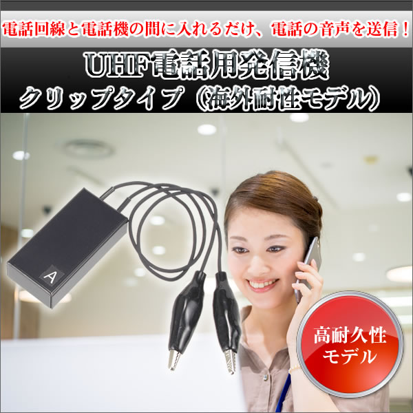 UHF会話用発信機をクリップで設置するモデル「UT-600」です。この商品は海外での使用も考えた耐久性の高いモジュ-ル設計となっております。 例えば、後進国などで使う場合、通常よりも大きな電圧が瞬間的にかかることがあります。これによる故障を防ぎます。電源は電話回線から供給しますので一度取り付けていませば、通電している間は故障しない限り半永久的に使用することが出来、電話での会話を着実にキャッチする事が出来ます。