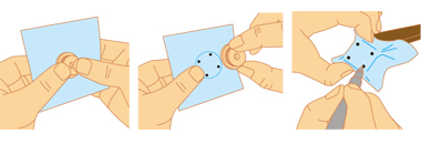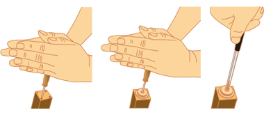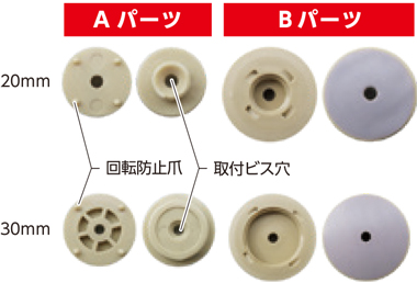 1.付属のAパーツ、Bパーツを確認する ![]() 取り付ける前に付属パーツを確認してください。 2.椅子脚の形状に合わせて、4ヶ所の穴位置に印を付けて下穴を開ける ![]() 3.中心のビス穴部分に下穴を開け、付属の取付ビスを取り付ける ![]() 4.Bパーツを右方向にしっかりと回して取り付ける