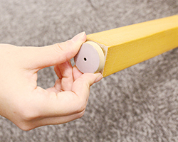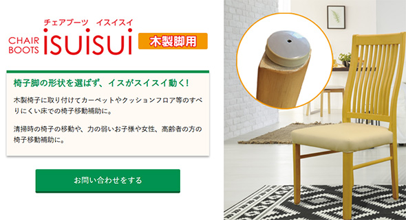 木製椅子に取り付けてカーペットやクッションフロア等のすべりにくい床での椅子移動補助に。 清掃時の椅子の移動や、力の弱いお子様や女性、高齢者の方の椅子移動補助に。 ![]() ![]() ●外れにくく、椅子脚にしっかり固定 木製の椅子脚に直接木ねじで取り付けるので、外れにくくしっかり固定できます。 ![]() ●椅子脚の形状を選ばず取り付け可能 木製の椅子脚であれば、丸脚・角脚・三角脚のいずれかにも取り付けできます。 ![]() ●軽い力でイスが動く 底面はスベリ効果の高い素材になっているので、カーペットやクッションフロア等のすべりにくい床面でも軽い力でイスの移動ができます。 ![]() ●手軽で便利なカートリッジ方式 椅子脚に取り付けるベース材と底面のスベリ部はねじ込み式のカートリッジ方式になっているのでスベリ効果が落ちてきた場合、スベリ部(別売り)のみ交換して使用できます。 ![]() ●床暖房にも使用可能 床暖房の最高表面温度は下地等の施工条件により異なりますが、室温20℃で35℃前後まで上がります。 本体材質は色移行しにくいTPE樹脂(エラストマー樹脂)製、底部のフッ素樹脂は熱による圧着成型なので、床暖房でも安心して使用できます。 ※接着剤、粘着剤は一切使用していません。 ![]() ●椅子脚サイズの計測方法 椅子脚が角脚・三角脚の場合は辺の一辺を、丸脚の場合は直径を測りサイズに合った製品をお選びください。 ※既に椅子脚キャップが付いている場合は、取り外して本製品をご使用いただくことをお勧めします。