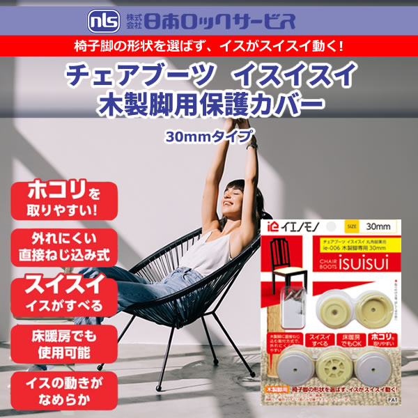 椅子脚の形状を選ばず、イスの動きがなめらかでイスがスイスイ動く!「チェアブーツ イスイスイ 木製脚用保護カバー 30mmタイプ ie-006」です。木製椅子に取り付けてカーペットやクッションフロア等のすべりにくい床での椅子移動補助に!清掃時の椅子の移動や、力の弱いお子様や女性、高齢者の方の椅子移動補助に適した商品です。直接ねじ込み式で外れにくく、ホコリを取りやすい設計です。