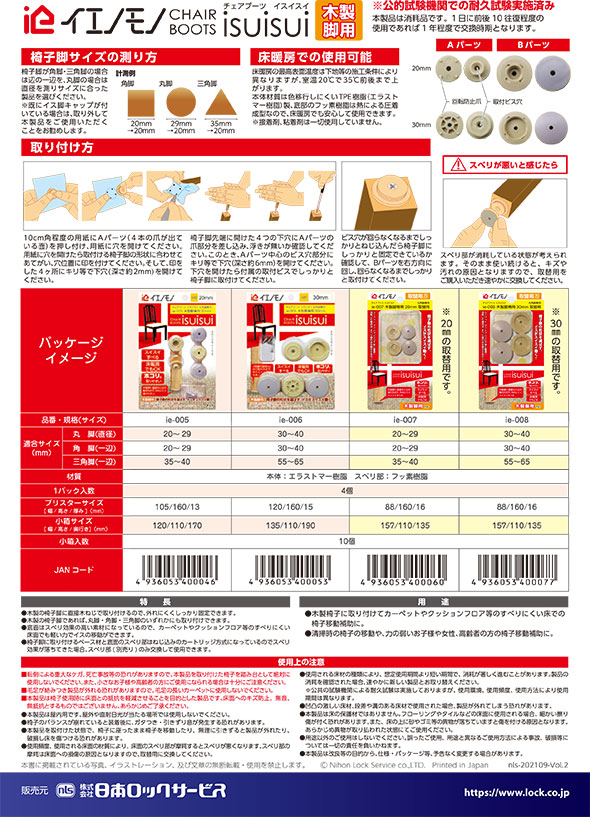| 製品名 | チェアブーツ イスイスイ 木製脚フローリング床用保護カバー 30mmタイプ ie-018 |