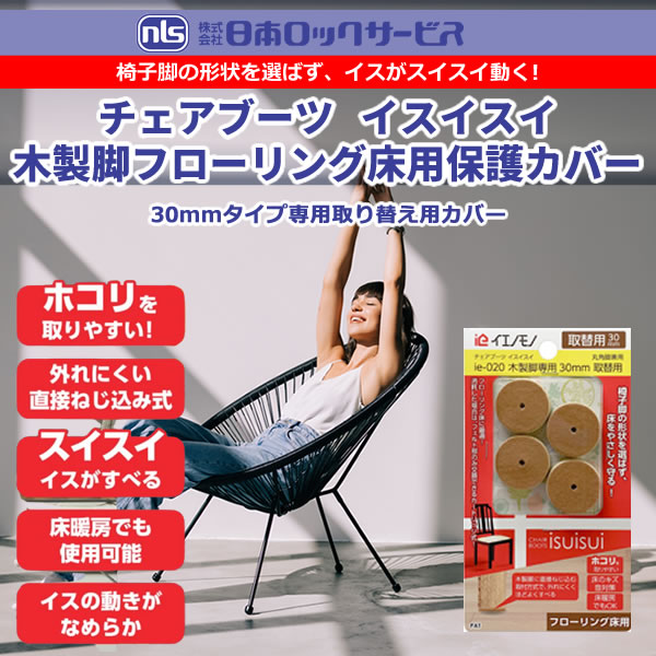椅子脚の形状を選ばず、イスの動きがなめらかでイスがスイスイ動く!「チェアブーツ イスイスイ 木製脚フローリング床用保護カバー 30mmタイプ専用取り替え用カバー ie-020」です。取り替え用ですのでie-18(30mmタイプ)に交換用として取り付けてフローリング床のキズ防止、椅子の引きずり音防止に!清掃時の椅子の移動や、力の弱いお子様や女性、高齢者の方の椅子移動補助に適した商品です。木製の椅子脚に直接木ねじで取り付けるので、外れにくくしっかり固定できます。木製の椅子脚であれば、丸脚・角脚・三角脚のいずれかにも取り付けできます。底面は床に優しいフェルト素材でフローリング床にキズをつけにくく、椅子の引きずり音を軽減し、軽い力で椅子の移動がスムーズにできます。椅子脚に取り付けるベース材と底面のフェルト部はねじ込みのカードリッジ方式なので、フェルトが摩耗してきた場合に交換して使用できます。