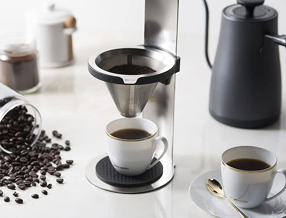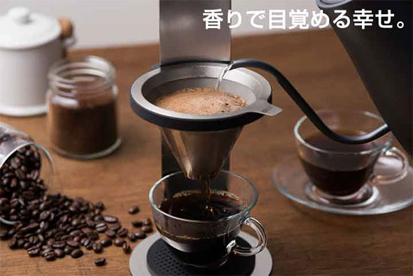 ティーカップからポットまで幅広く対応したコーヒーメーカー。上下するドリッパーでどんな高さのポットやカップにもフィット。