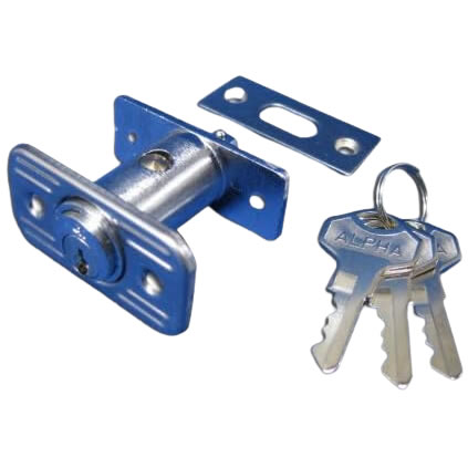 アルファ社製プッシュ式シリンダー栓錠503番です。引違戸2枚の真ん中のあわせ部に付けます。 シリンダー部(カギ差込部)の直径18ミリ、長さ34ミリです。カギ3本付。