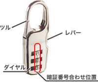- ダイヤルを暗証番号に合わせ、横のレバーを押し、ツルが開く状態(開錠状態)にします。