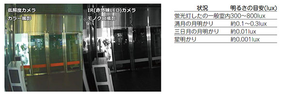 ◎低照度の明りでカラー撮影が可能。暗闇ではモノクロ撮影に自動切替えレコーダーに繋いで取り逃しのない録画が可能な有線カメラです!![]() ![]() ![]() ![]() ![]() ![]() ![]() ![]() ![]() ![]() ●夜間撮影 低照度センサーとIRセンサー(赤外線LED)が搭載しており、周囲の明るさによりセンサーが自動切替し、カラー・モノクロ撮影を行います。 ●明るさの目安 低照度センサーある程度の明るさ(三日月の月明かり0.01lux程度)でカラー撮影が可能です。それより暗いところではモノクロ撮影になります。 ![]() IRセンサー(赤外線LED)周囲の明るさ0luxの場合は赤外線でのモノクロ撮影赤外線撮影距離は、最大約20mまで可能です。赤外線投光範囲内に被写体がない場合は何も映らない状態になります。(赤外線が反射しないため真っ暗になる) 屋外に設置可能(IP67・IP66相当)