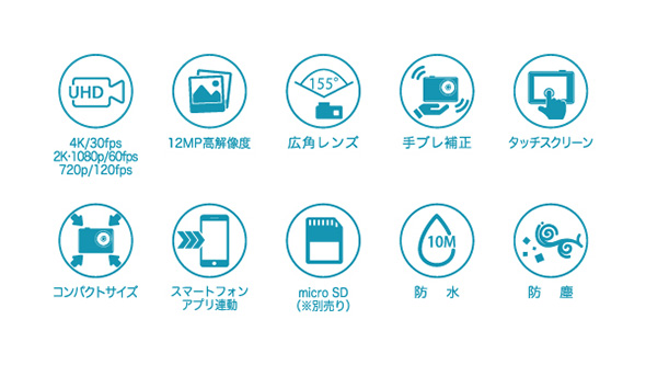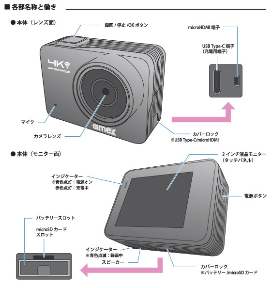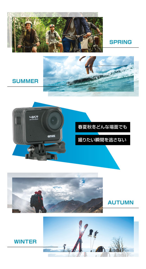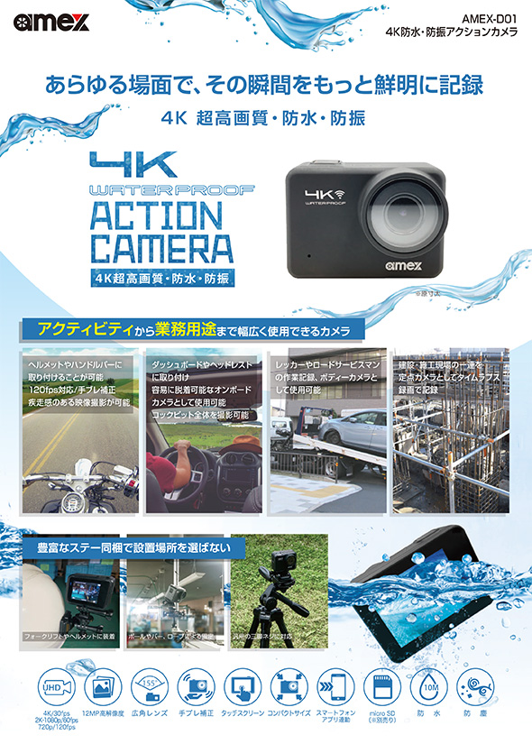 Q.開封時、すぐに使えますか。 A.ご使用の際は、付属のUSBケーブルで初期充電を必ず行ってください。充電が完了するとモニター面の赤いLEDランプが消灯します。 Q.充電コードはどこに差し込めばいいのか。 A.本体側面のカバーロックを開けると充電用端子(USB Type-C 端子)がございますので、そちらへ差し込んでください。 Q.充電しながらでも録画することはできるのか。 A.充電中でも録画は可能ですが、充電の際はカバーロックを外しケーブル接続部が露出します。 そのため、防水機能が損なわれますので十分ご注意ください。 Q.SDカードが付属していないため録画ができません。 A.SDカードは別途ご購入いただく必要がございます。(純正品の設定あり) ・UHSスピードクラス:U3以上(推奨)・容量:4~128GB Q.本機がフリーズしてしまった時の対処法はあるのか。 A.microSDカードのフォーマット、電源(内部バッテリー)の抜き差しをお試しください。 Q.録画した映像の音が小さく聞こえにくい。 A.防水構造上、集音用マイク孔が小さくなっております。パソコンやスマートフォンで再生する際は、再生機器側のボリュームレベルを調整ください。 Q.テレビやモニターなどに接続して、リアルタイム映像を確認することはできるか。 A.Micro HDMIケーブルで本機とテレビに接続し、カメラモードにすることでご使用いただけます。 Q.撮影中に映像のズーム機能は搭載されているのか。 A.搭載しておりません。そのため同じ画角での撮影となります。 Q.CALS(キャルス)モードは搭載されているのか。 A.搭載しておりません。 Q.WEBカメラとして使用できるのか。 A.付属のUSBケーブルで本機とパソコンを接続し、カメラモードにすることでご使用いただけます。 ※本機能はWindows標準搭載の「カメラ」のアプリでの使用を想定しております。 Q.三脚の雲台にカメラを取り付けたい。 A.付属の部品をご使用いただくことで雲台に取付が可能となります。アクションカメラ(本体)/カメラフレーム / カメラネジマウント(真ん中のネジ穴が金色のマウント)/ ベースマウントクリップ / マウントネジ(他の部品に付属の長いネジ)※本機は国際基準のサイズ(1/4サイズ)ですが、雲台によってはサイズが異なるためご注意ください。 |