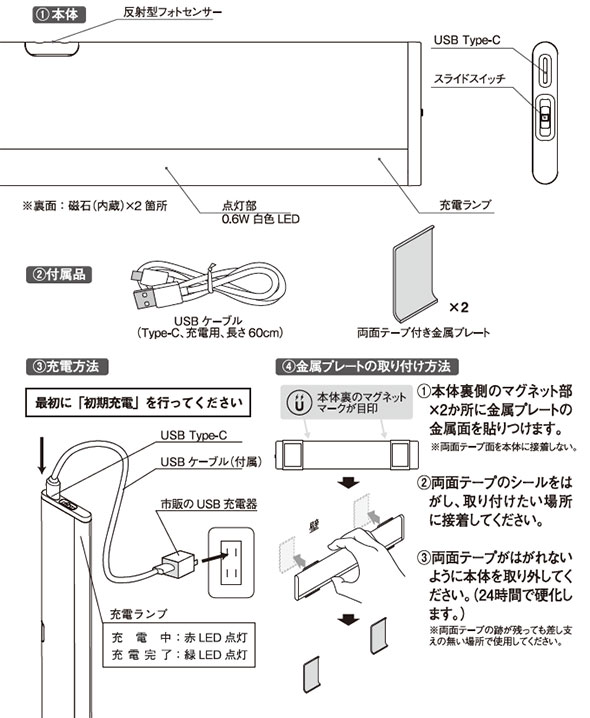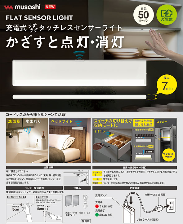 ![]() ![]() ●かざすと点灯・消灯 超薄型充電式センサーライトシリーズ。 手をかざすと点灯、もう一度かざすと消灯します。手をかざし続けると無段階で明るさを調整できます。充電式で繰り返し使えます。コードレスだから様々なシーンで活躍。 ![]() ●収納モード スイッチを切り替えで収納モードに変わります。 収納モードでは、開けると点灯、閉じると消灯に動作が変わります。引き出しやロッカーに設置すると便利です。 ![]() ●薄型なのですっきり邪魔になりくくスマートに設置できます 洗面所やベッドサイドに ![]() ![]() ![]() ![]() |