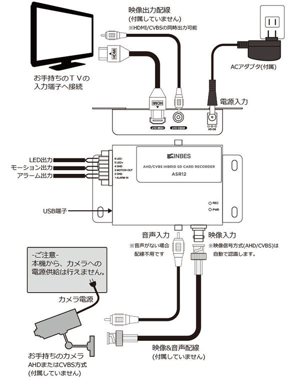 ![]() ![]() ![]() ![]() ![]() ![]() ■AHDカメラ対応のSDカードレコーダー 1080p/720pの両方に対応 接続されたAHDカメラの解像度を認識して最大1080p(1902x1080)のフルハイビジョン画質で映像記録が行えます。 ■従来のアナログカメラ(CVBS)にも対応 これまでのアナログカメラも接続して録画可能です。(録画解像度:640x360) アナログカメラはそのままで従来機からの入替えもスムーズに行えます。 ■ASR12単体モデル、屋外ボックス収納タイプの2種類をご用意 本体のみの標準モデル「ASR12」と屋外用ボックスに収納した「ASR12-BX」の2モデルをご用意。 屋外用ボックスには、外部LED、3口コンセント、小物入れを装備、100V電源を接続するだけで屋外利用できるので街頭防犯システムとして活用する場合など屋外への設置が容易です。 再生 ■本体 or Windows PCで再生 映像の再生は、ASR12本体から直接行う方法とパソコンでSDカードを読み込んでの2通りで行う事ができます。パソコンでの再生時はAVI形式が再生出来る汎用プレーヤーソフトが必要になります。 ![]() ■パスワードロック機能(PC再生時のみ) パソコンでの再生の際、録画ファイルにパスワードロック(数字4桁)をかけることができます。 パスワードロック機能を使用した場合、パソコンからのデータ再生は専用アプリケーションからパスワードロックの解除が必要になります。 外部出力 ■「LED出力」で死活確認 本体に外部LEDへの出力端子を搭載。ボックス等へ収納した際でもLED出力を利用してLED表示を外部に設けることでにボックスの外からでも録画の死活確認ができます。(DC2V) ■「モーション出力」で外部機器と連動 本機でモーション検知の際、外部へ信号出力が行えます。(3.3V)(DC2V) ■「センサー入力」で外部機器信号を受けて録画 他機器からのNC/NOタイプの入力を受けて、録画することができます。 録画 ■128GBまでのSDXCカードに対応 SDカードはSD/SDHC/SDXCに対応(Class10推奨)。 最大で「SDXC 128GB」まで対応しています。 SD カードの種類と寿命について SD カード (SD/SDHC/SHXC) は、書込みに限度がある消耗品です。 本機で常時録画した場合の期待寿命、市販のSD カードで約1 年となります。 長期間の稼働や高い信頼性が必要な場合、SDカードは定期的に交換していただくか、業務用( 産業用) のSD カードをご 使用ください。業務用SD カードについての詳細は当社までお問い合わせください。 ■証拠となるタイムスタンプ機能 録画の際は日付と時刻も一緒に記録します。 万が一の際、確実な証拠となります。 ■録画時間の目安 撮影している映像により多少異なりますので、目安としてご参考ください。 SDカード容量【32GB】 ![]() SDカード容量【128GB】 ![]() 録画時間について 録画日数は平均的な目安となります。 撮影される映像の状態(動きの大小、昼・夜間など)によって増減しますのでご承知おきください。 表中の単位は「日数」となります。例:7.0日 ( 7 x 24 = 168時間) 操作・機能 ■使いやすい日本語メニュー 設定メニューは日本語で表示。使いやすくかんたんに設定が行えます。 ■停電後も自動復旧 停電後、電源が戻れば自動で元の録画設定に戻り録画を再開します。 遠隔地などでご利用の場合等、すぐに機器を確認できない場合も安心です。 -ご注意- 録画中に電源が切れた場合、最後に録画していたデータは保存されません。 また、本機は「停電対策」をしておりますが、録画中頻繁に電源の入切が行われた場合、稀にSDカードに不具合が生じる可能性があります。停電時以外は録画を止めてから電源を切るようにしてください。 |