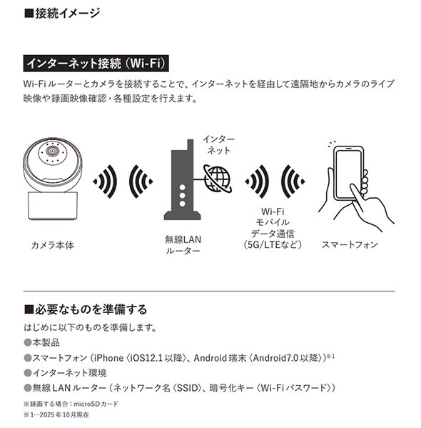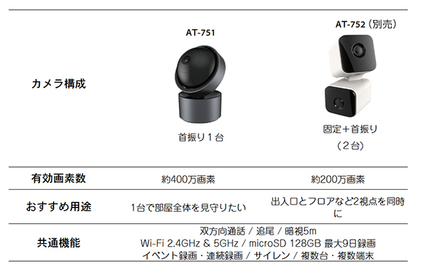 「ちょっと見たい」「見ておけたら」の安心感に寄り添うWi-Fiカメラ![]() ![]() ![]() ![]() ![]() ![]() ![]() ![]() ![]() ![]() ●お部屋に馴染みやすいデザイン性の高いフォルム ![]() 置くだけ、すぐ見られる USBケーブル1本でつなぐだけのシンプル設計。操作は専用アプリから。 ![]() 見たいところに旋回 スマートフォンから操作して好きなところにカメラを向けられます。 ![]() 声でも伝わる(声かけ機能) スマホに呼びかけて、家族やスタッフへの声かけや連絡が行えます。 ![]() 2タイプのカメラから選べます 基本機能は共通ですが、AT-751は1台で高画質・広範囲を、AT-752(別売)は2台で入口とフロアを同時に。用途に合わせてお選びいただけます。 ●ちょっと見れると家庭もオフィスも安心 ![]() 子供・ペットの見守り 首振りで部屋全体をチェック。必要なときは声かけで安心。 ![]() 介護サポート 離れて暮らす家族の“元気?”を確認。暗視で夜間も把握。 ![]() 受付・出入口 AT-752(別売)なら固定カメラで入口、旋回カメラでフロアをカバー。 ![]() 小規模オフィスのフロア管理 1つのアプリで複数カメラをまとめて管理できます。 ●3ステップで導入かんたん ![]() 1. 置く/固定する カメラは置くだけでOK(付属パーツで壁や天井にも固定できます) ![]() 2. 電源をつなぐ USBケーブルを接続。(市販のスマートフォンの充電ケーブルでも使用可能) ![]() 3. アプリで登録・設定 スマートフォンアプリを起動して初期設定を行えば設定完了です。 ●操作は丸っとスマートフォンから カメラの向きを動かすのも、映像をチェックするのも、家族に声をかけるのも、スマートフォン1つで完結します。 ・ライブ映像視聴 ・パンチルト操作 ・映像再生 ・複数カメラ登録 ・サイレン発音 ●複数台登録や映像のシェアもできる ![]() 複数台のカメラを1つのアプリに登録が可能です。 1つのカメラを複数人で共有 複数のスマートフォンから同じカメラの映像が見れます。 ●見守りを支える安心機能 ![]() 最長9日間の記録 microSDカード(別売)を使用して、最長216時間(9日)の記録ができます。 ![]() 選べる録画方法 動体検知、連続、手動録画が可能。自動上書きも設定できます。 ![]() 暗視撮影機能 赤外線撮影モード搭載(最大5m)カラーモードのみでも撮影可能。 ![]() 自動追尾 動くものを見つけた際にカメラが自動で追従します。 ![]() サイレン発音 もしもの時、カメラからサイレンを発音させることができます。 ![]() 2.4GHz/5GHz両方のWi-FI に対応。 |