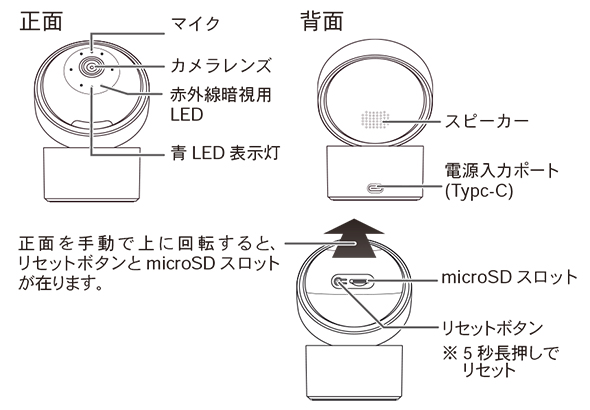 ![]() 2.電源用USBケーブル(Type-C) 3.取付ブラケット 4.取付けネジセット(ネジ、アンカーボルト) 5.クイックスタートガイド(保証書含む) ※microSDカード・ACアダプターは同梱しておりません。 |