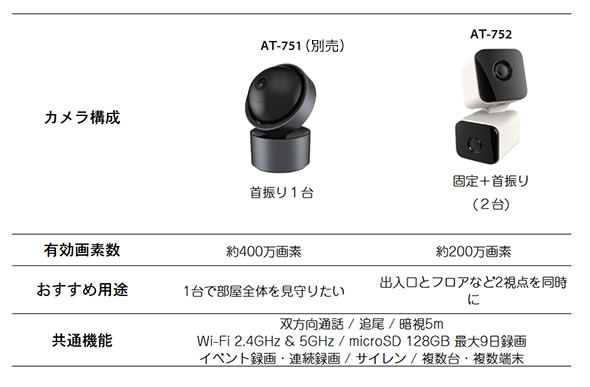 「ちょっと見たい」「見ておけたら」の安心感に寄り添うWi-Fiカメラ![]() ![]() ![]() ![]() ![]() ![]() ![]() ![]() ![]() ![]() ![]() ![]() ●お部屋に馴染みやすいデザイン性の高いフォルム ![]() 置くだけ、すぐ見られる USBケーブル1本でつなぐだけのシンプル設計。操作は専用アプリから。 ![]() 見たいところに旋回 スマートフォンから操作して好きなところにカメラを向けられます。 ![]() 声でも伝わる(声かけ機能) スマホに呼びかけて、家族やスタッフへの声かけや連絡が行えます。 ![]() 2タイプのカメラから選べます 基本機能は共通ですが、AT-751(別売)は1台で高画質・広範囲を、AT-752は2台で入口とフロアを同時に。用途に合わせてお選びいただけます。 ●ちょっと見れると家庭もオフィスも安心 ![]() 子供・ペットの見守り 首振りで部屋全体をチェック。必要なときは声かけで安心。 ![]() 介護サポート 離れて暮らす家族の“元気?”を確認。暗視で夜間も把握。 ![]() 受付・出入口 AT-752なら固定カメラで入口、旋回カメラでフロアをカバー。 ![]() 小規模オフィスのフロア管理 1つのアプリで複数カメラをまとめて管理できます。 ●3ステップで導入かんたん ![]() 1. 置く/固定する カメラは置くだけでOK(付属パーツで壁や天井にも固定できます) ![]() 2. 電源をつなぐ USBケーブルを接続。(市販のスマートフォンの充電ケーブルでも使用可能) ![]() 3. アプリで登録・設定 スマートフォンアプリを起動して初期設定を行えば設定完了です。 ●操作は丸っとスマートフォンから カメラの向きを動かすのも、映像をチェックするのも、家族に声をかけるのも、スマートフォン1つで完結します。 ・ライブ映像視聴 ・パンチルト操作 ・映像再生 ・複数カメラ登録 ・サイレン発音 ●複数台登録や映像のシェアもできる 複数台のカメラを1つのアプリに登録が可能です。 1つのカメラを複数人で共有 複数のスマートフォンから同じカメラの映像が見れます。 ●見守りを支える安心機能 ![]() 最長9日間の記録 microSDカード(別売)を使用して、最長216時間(9日)の記録ができます。 ![]() 選べる録画方法 動体検知、連続、手動録画が可能。自動上書きも設定できます。 ![]() 暗視撮影機能 赤外線撮影モード搭載(最大5m)カラーモードのみでも撮影可能。 ![]() 自動追尾 動くものを見つけた際にカメラが自動で追従します。 サイレン発音 もしもの時、カメラからサイレンを発音させることができます。 ![]() 2.4GHz/5GHz両方のWi-FI に対応。 |