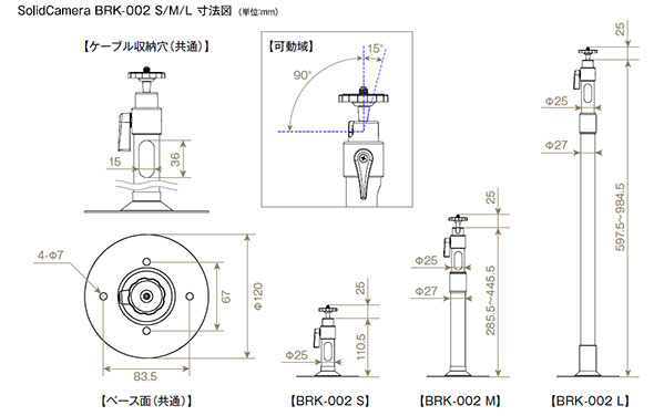 カメラ設置後の位置調整がさらに手軽に!BRK-002はケーブルを通し、すっきり配線ができるブラケットです。設置環境に合わせ、S/M/Lの3サイズからお選びいただけて、M/Lの2サイズは長さの調節も可能です。上下90 ~ -15°で左右360°の調整が可能です。ViewlaのIPC-05シリーズ、IPC-07シリーズ、IPC-08シリーズに取り付けできます。他社製品のカメラでも使用可能です。
