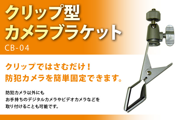 クリップではさむだけ!防犯カメラを簡単固定できます。 クリップ型カメラブラケットCB-04は、ネジ止めができない箇所へカメラを取り付けることができます。 防犯カメラ以外にもお手持ちのデジタルカメラやビデオカメラなどを取り付けることも可能です。 取付けについて 下記のサイズ範囲で取付けが可能です。 幅:40mm~ 高さ(最大):40mm 奥行き(最大):30mm 耐荷重(最大):450g ※適合サイズ内であってもうまく取り付けられない箇所や物 薄い板など 挟込時に奥行きの取れない場所 細いパイプや棒(φ30mm以下) 表面がつるつるした素材 滑りやすい素材 ※耐荷重に満たない重量のカメラであっても、設置箇所やカメラのバランス等の諸条件で うまく設置ができない場合があります。 |
