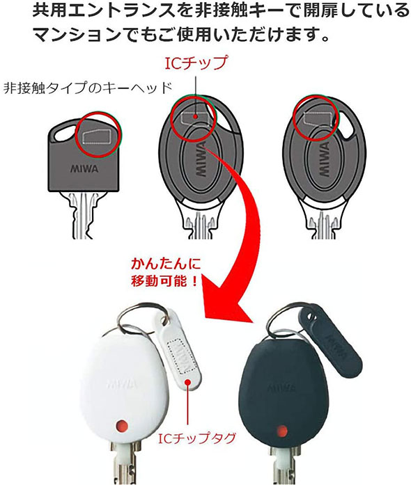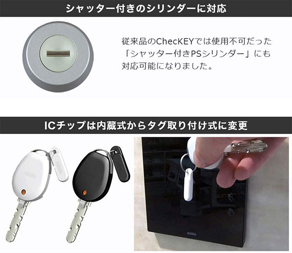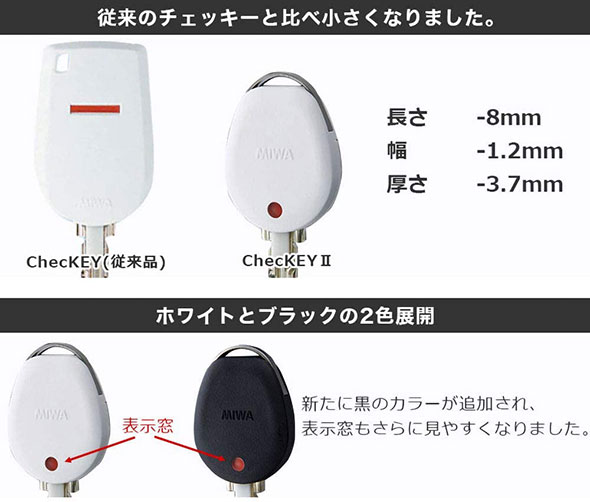 ![]() ![]() ![]() ![]() ![]() ![]() ![]() ![]() ![]() ![]() ■カギを閉めて出て来たか不安 ![]() 空き巣被害の約4割がドアや窓の閉め忘れが原因と言われており、外出時にはカギの閉め忘れの不安がつきものです。 ■鍵の施解錠状態をひと目で確認! ![]() ChecKEY2(チェッキー2)を、お手持ちのカギに取付けておけば、これまでのようにご自身の記憶に頼ることなく、鍵の閉め忘れを視覚的に確認でき、不安の解消にもなり、また、カギ掛けの習慣付けにも役立ちます。 単身世帯向けに開発された「ChecKEY2(チェッキー2)」は、1人暮らしの高齢者や女性の方におススメの商品です。 ■ChecKEY2操作方法 ![]() ChecKEY2(チェッキー2)は、カギを閉めると本体の表示窓の色が変わり、施錠・解錠の状態がひと目で確認可能! カギの操作感や施錠音に加え、目視でもカギの開け閉めの状態をチェックすることができます。 表示の色には、橙色と白色の2種類で、識別しやすくなっています。また、使用者が色の違いによる施錠状態の混乱を防ぐために、本体に貼り付けておく「施錠・解錠シール」も付属しています。 ■鍵番号を隠して不正な合鍵作成を防止! ![]() 家の玄関ドアの鍵は、キーに刻印されている鍵番号さえわかれば、誰でも簡単に合鍵が作れてしまいます。ChecKEY2を取り付ける事で鍵番号が隠れますので。「カギの閉め忘れ防止」と「鍵番号の盗み見防止」のまさに一石二鳥の防犯グッズです。 ■ドライバー1本でかんたん取り付け ![]() 本商品の取り付けには、プラスドライバー(1番)をご用意ください。 樹脂カバーが付いているキーをご使用の場合は、取り外しの際にマイナスドライバー(刃幅2mm)が必要です。 ■ChecKEY2を取付可能なキーの種類 ![]() キーの持ち手部分のデザインが上図と同じキーにはChecKEY2が装着可能です。(現在初代ChecKEYをご使用中の場合は付け替えも可能です。) ■ChecKEY2を使用できないカギの種類 ![]() 上図のタイプの鍵には使用できません。ご購入前にご確認ください。 ■共用エントランスの非接触キーも使用可能 ![]() 共用エントランスを非接触キーで開扉しているマンション物件でもご使用いただけます。キーの持ち手部分に上図のような樹脂カバーがついている場合は、樹脂カバーを取り外してキー本体の形状をご確認ください。 ※樹脂カバー内のICチップは入れ替えが必要になります。 ■従来のチェッキーより小さく ![]() 従来のチェッキーと比べて、長さ:-8mm、幅:-1.2mm、厚さ:-3.7mm小さくなりました。 ■ホワイトとブラックの2色展開 ![]() 新たに黒のカラーが追加され、表示窓もさらに見やすくなりました。 ■シャッター付きのシリンダーに対応 ![]() 従来品のChecKEYでは使用不可だった「シャッター付きPSシリンダー」にも対応可能になりました。 ■ICチップはタグ取り付けしに ![]() 従来品のChecKEYでは、非接触キーのICチップは内蔵式でしたが、ChecKEY2はタグ取り付け式に変更されました。 |