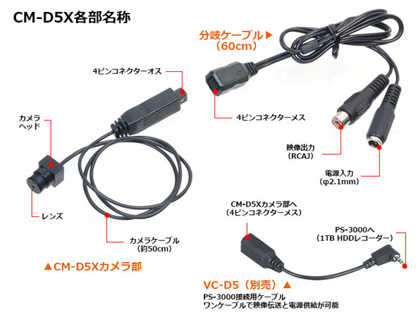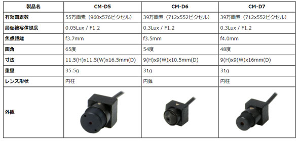 ![]() カメラエンジンにCCIQⅢチップを採用、水平解像度710TV本を実現し、小型ながら高解像度を誇ります。 ■11mm角の小型カメラヘッド カメラヘッド部の外寸は、11.5(H)×11.5(W)mmと非常に小型なデザインとなっています。 ■フォーカス調整可能 CM-D5Xはフォーカスの調整が可能です。近接撮影に対応します。 ■最低被写体照度0.05Lux わずかΦ1mmのピンホールレンズを採用しているにもかかわらず最低被写体照度は0.05Luxを実現、高感度設計になっています。 ■CM-Dシリーズ比較表 ![]() ■PS-3000接続用ケーブル CM-D5XをPS-3000に接続する為のオプションケ-ブル (VC-D5) をご用意しました。ワンケ-ブルで映像伝送と電源供給を行います(「各部名称」の写真をご参照ください)。 |