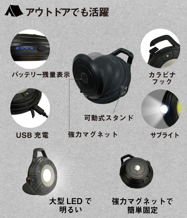 ◎メインライトとサブライトで2ウェイ活躍するポータブルライト、充電式で乾電池が不要、マグネット付きでいろいろな場所に簡単設置。アウトドアにも大活躍。非常時のライトとして、カラビナフック付き。