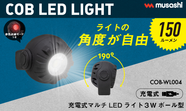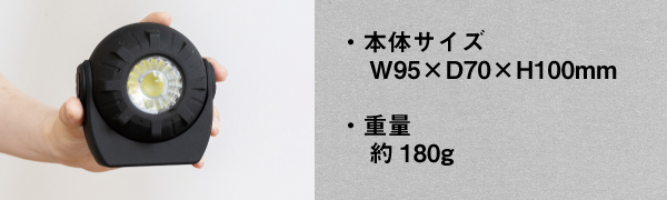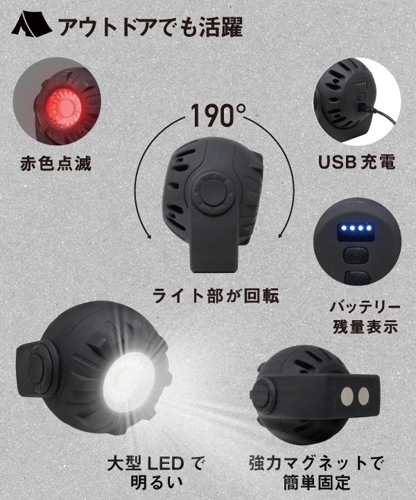 ◎大型LEDで明るいポータブルライト、充電式で乾電池が不要、マグネット付きでいろいろな場所に簡単設置。アウトドアにも大活躍。赤色点滅で非常時のライトとして利用可能。回転して狙ったところを明るくする。