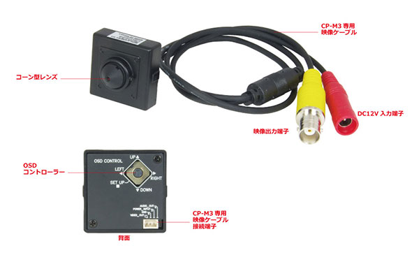 ![]() ●200万画素STARVIS CMOS搭載 撮像素子にSONY製200万画素STARVIS CMOSを採用。撮影対象の細部までを細かく描写します。 ●4種類の信号方式 CP-M3は、4種類の信号方式に対応しています。AHD, HD-TVI, HD-CVI、そしてCVBS(アナログ)から選択が可能です。 ※映像を映すためには、これらの信号に対応したHDDレコーダー、もしくはモニターが必要です。 ※AHD(アナログハイビジョン信号)は、相性問題により映像が正常に表示されない、または認識されない場合があります。 ●デイ&ナイト機能 明るい環境下ではカラーで、暗い環境下では自動でモノクロ(白黒)に切り替わって撮影します。 ※CP-M3は暗視カメラではありません。環境により暗所での撮影に適さない場合があります。 ![]() ●逆光補正機能 逆光時に発生する画面上の明暗差を、最適に映るようにする機能を搭載しています。 ●ノイズ軽減機能 暗所撮影時などで発生する映像ノイズを軽減する機能を搭載しています。 ●OSDコントローラーの提供 本体背面にOSDコントローラーを搭載しています。OSDコントローラーを使って、カメラに搭載された各種機能の設定ができます。 また、OSDコントローラーのレバーで、映像出力方式(AHD,TVI,CVI,CVBS)の変更ができます。 ![]() ●CP-M3接続例 CP-M3の映像を映すにはディスプレイやハードディスクレコーダー(HDDレコーダー)に接続する必要があります。