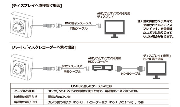※1 ディスプレやHDDレコーダーの購入をご検討の際は、CP-M3をご購入になられた販売店様へご相談ください。※2 ディスプレイやHDDレコーダーの操作方法については、それぞれの取扱説明書をご覧ください。これら機材のサポートについてはご購入になられた販売店様へご相談ください。 |