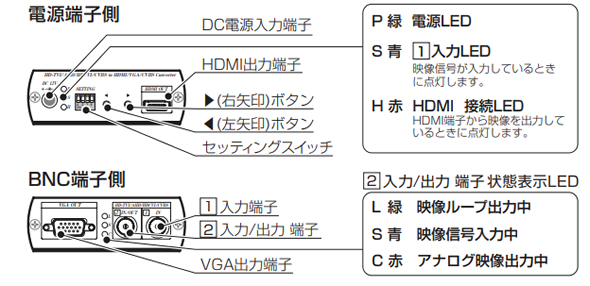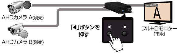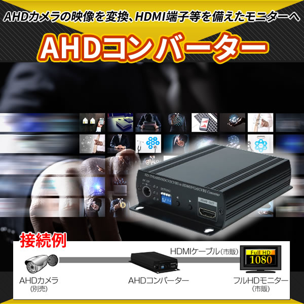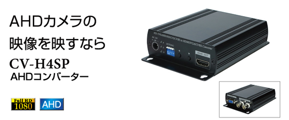 | 【特徴】 CV-H4SPはAHDカメラの映像を変換し、HDMI端子やVGA端子を備えたモニターに映すためのコンバーターです。 AHDレコーダーを通さずにモニターに映したい場合や、コンポジット映像(BNC端子)に変換できるため、 既設のアナログカメラシステムにAHDカメラをつなげる場合にご使用ください。 ![]() ![]() ●AHDカメラ映像をAHD2.0レコーダーを通さずにモニター表示 AHDカメラの映像をAHD2.0レコーダーを通さずにフルハイビジョンでモニターに映すことができます。 フルハイビジョンモニター(HDMI)とパソコンモニター(VGA)へ同時出力も可能です。 ![]() ●既設のアナログカメラシステムにAHDカメラを接続(CVBS変換出力) AHDカメラを既設のレコーダー(CVBS) やモニター(CVBS) につなげることができます。 ![]() ●2台のカメラの映像を切替えて表示(AHD 2入力) AHDカメラの映像は手動で切替えることができます。 ![]() ●カメラAの映像画面の中に、カメラBの映像画面を表示(AHD 2入力時PIP) メイン画面とサブ画面のカメラ映像は手動で切替えることができます。 ![]() ※PIP=ピクチャーインピクチャー |
