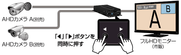 セッティングスイッチの切替えで動作状態や入出力状態の設定変更ができます。 ![]() ●1台のカメラ+モニター2台の接続イメージ カメラ1台の映像をフルハイビジョンでモニターに映します。 ![]() ●1台のカメラ+モニター3台の接続イメージ CVBSモニター(BNC端子)、パソコンモニター(VGA端子)、HDMI端子に対応した映像出力端子を備えており、 最大3台のモニターに同時に映像を映すことができます。 ![]() ●2台のカメラ(PIP)+モニター2台の接続イメージ カメラ2台の映像をパソコンモニター(VGA端子)、HDMI端子それぞれのモニターに同時に映すことができます。 ![]() ※PIP=ピクチャーインピクチャー PIP(ピクチャーインピクチャー)の設定 ●サブ画面の表示位置を変更する場合の設定 サブ画面の表示位置を「左・右 矢印」ボタンで変更できます。上下左右の四隅に変更することができます。 ![]() ●サブ画面の大きさを変更する場合の設定 サブ画面の大きさを「左・右 矢印」ボタンで変更できます。 サブ画面のメイン画面との割合いは最小時でおよそ25%、最大45%まで10段階で調整可能です。 ![]() |
