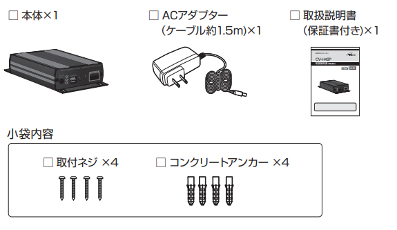 ![]() 本体・ACアダプター(ケーブル長 約1.5m)・取扱説明書(保証書付)・取付ネジ4本・コンクリートアンカー4本 |