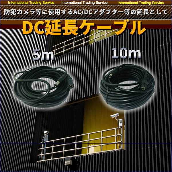 防犯カメラ等に使用するAC/DCアダプター等のケーブル延長に「DC延長ケーブル 5mタイプ 10mタイプ」です。長さ:5mと10m、端子:DC端子ジャック+プラグ、DCプラグ:内径φ2.1mm、DCプラグ:外径φ5.5mmとなっています。