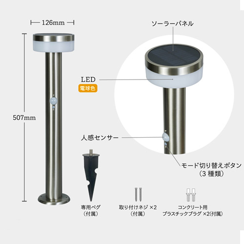 しっかり明るいガーデンライト。 ソーラー発電で電源工事やメンテナンスは不要。設置するだけで使用できます。 周囲が暗くなると自動点灯し、人が近づくとさらに明るく点灯するセンサー機能付き。お庭や家回りを演出するガーデンライトや防犯対策に。 高級感がありサビに強いステンレス製。6種類のラインナップからお選びいただけます。 ![]() 【ブラック】 ![]() ![]() ![]() 【シルバー】 ![]() ![]() ![]() ●明るさ 常夜灯は15ルーメン、センサー反応で150ルーメンの明るさ。 ![]() ●3種の点灯モード [A]常夜灯のみ、[B]常夜灯+センサー点灯、[C]センサー点灯のみの3種の点灯モード切替ができます。 ![]() ペグ止めとネジ止めの2種類の設置方法 土にはペグ止め、コンクリート地にはネジ止めで設置することができます。 ![]() ![]() |