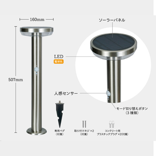しっかり明るいガーデンライト。 ソーラー発電で電源工事やメンテナンスは不要。設置するだけで使用できます。 周囲が暗くなると自動点灯し、人が近づくとさらに明るく点灯するセンサー機能付き。お庭や家回りを演出するガーデンライトや防犯対策に。 高級感がありサビに強いステンレス製。6種類のラインナップからお選びいただけます。 ![]() ![]() ![]() ![]() 【シルバー】 ![]() ![]() ●明るさ 常夜灯は40ルーメン、センサー反応で380ルーメンの明るさ。 ![]() ●3種の点灯モード [A]常夜灯のみ、[B]常夜灯+センサー点灯、[C]センサー点灯のみの3種の点灯モード切替ができます。 ![]() ペグ止めとネジ止めの2種類の設置方法 土にはペグ止め、コンクリート地にはネジ止めで設置することができます。 ![]() ![]() |