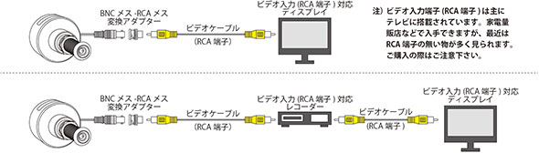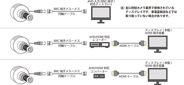 ※1 AHD(アナログハイビジョン信号)は、稀に相性問題により映像が正常に表示されない場合や認識されない場合がございます。※2 AHDモデルは「アナログモデル接続例」にある接続方法ではご利用頂けません。 ※3 HDDレコーダーやディスプレイの購入をご検討の際は御相談ください。 ■アナログモデルでの接続例 ![]() ※1 アナログモデルは「AHDモデル接続例」にある接続方法ではご利用頂けません。 ※2 HDD レコーダーやディスプレイの購入をご検討の際は、御相談ください。 ■ご購入にあたってのご注意 カラードアカムHD には、数種類の映像信号に対応した撮像素子(CMOS)が搭載されています。 カラードアカムHD を接続するHDD レコーダーによっては、レコーダー側からカラードアカムHD の信号方式やカメラの設定を操作する事が可能な場合がありますが、これら設定の変更は絶対に行わ ないで下さい。これら設定を変更した為に発生した不具合等については保証対象外となり、全て有償 修理または有償での再調整となります。ご注意下さい。 |